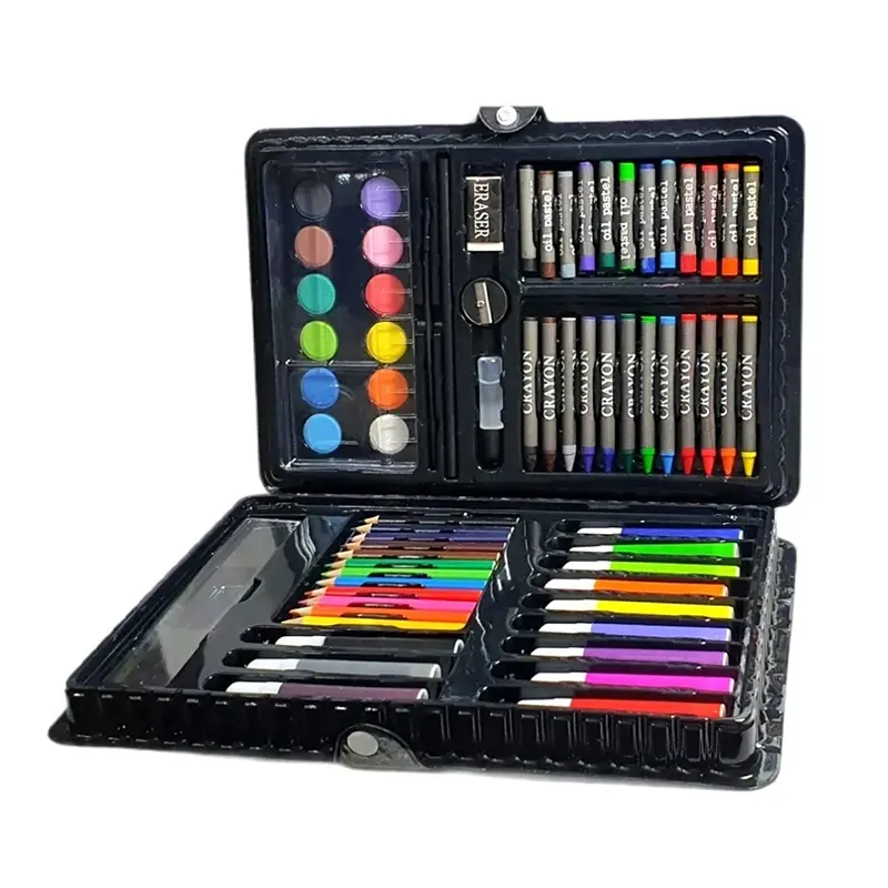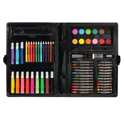Set escolar 68 piezas que incluye: 12 Fibrones de colores 12 Lapices de colores 12 Pasteles al oleo 12 Crayones de colores 12 Acuarelas 1 Regla 15cm 1 Pincel 1 Lapiz Negro 1 Pegamento 1 Sacapuntas 1 Goma Medida de la valija cerrada: 21x30 cm